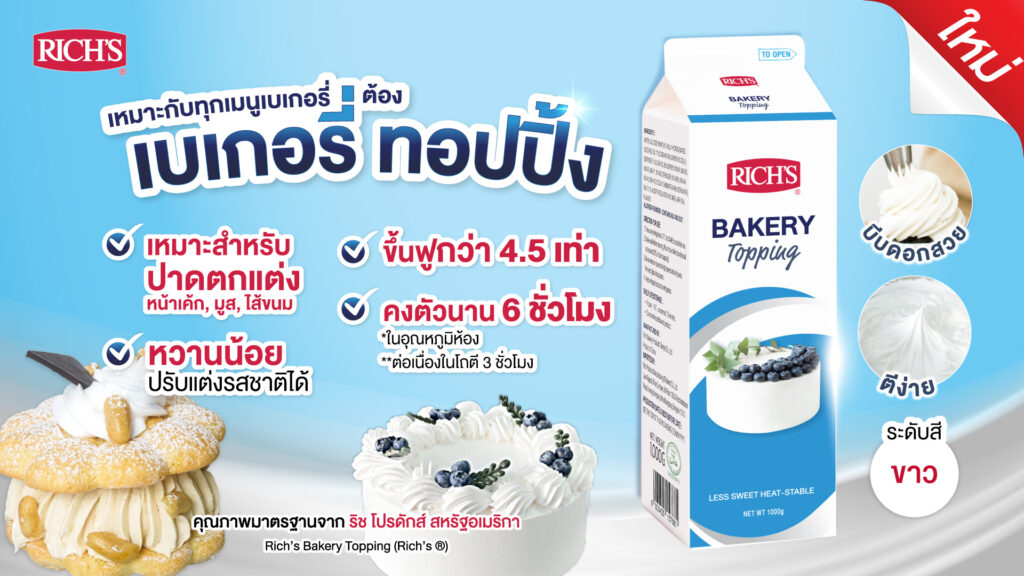 บทความนี้ได้รวบรวม 12 สูตรเบเกอรี่ ที่รังสรรค์จากริชส์ เบเกอรี่ ทอปปิ้ง วิปปิ้งครีมน้องใหม่จากริช โปรดักส์ เป็นสูตรที่ทางเชฟของริชส์คิดค้นขึ้นเป็นพิเศษ เพื่อให้คุณได้ลองทำตาม หรือใช้เป็นแรงบันดาลใจในการสร้างสรรค์เมนูใหม่ ๆ ที่ตอบโจทย์ผู้บริโภคยุคใหม่ได้อย่างตรงใจ เหมาะกับเป็นเมนูวางขายหน้าร้าน โดยทุกสูตรคำนวนต้นทุนพร้อมทำขาย