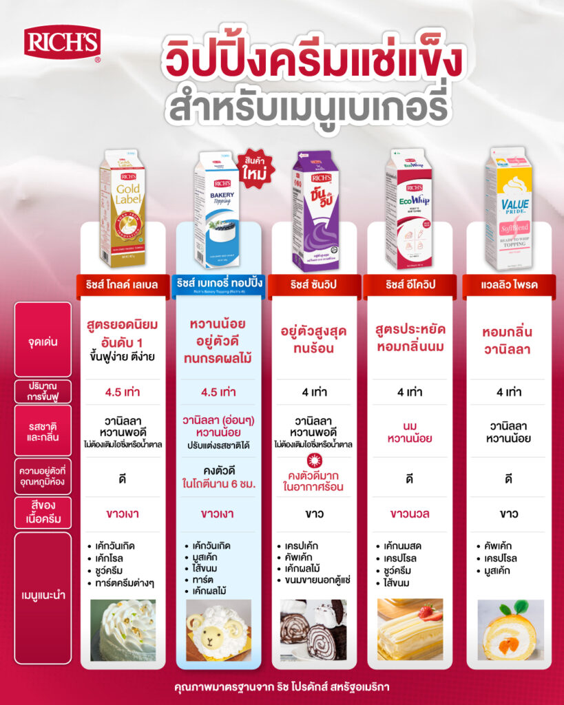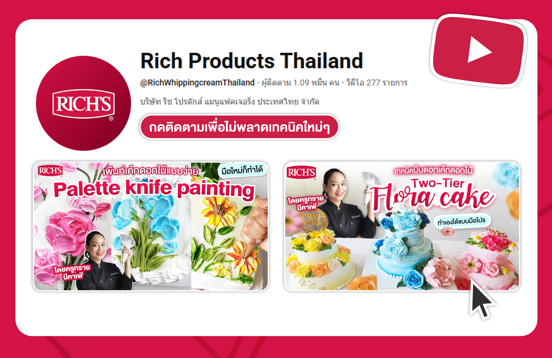 โชว์สกิลการทำเบเกอรี่ปาดตกแต่งแบบมือโปร ด้วยเมนูเบเกอรี่สูตรที่ริช โปรดักส์คัดสรรมาให้ รังสรรค์ด้วยวิปปิ้งครีมจากริชส์ ที่ตอบโจทย์การใช้งานของคนทำเบเกอรี่ได้เป็นอย่างดี