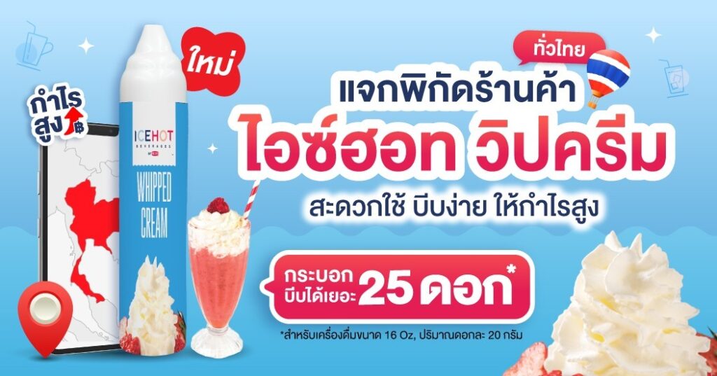 วิปครีมหนานุ่มออนทอปเครื่องดื่มเป็นทอปปิ้งสุดคลาสสิกที่ช่วยสร้างกำไรและเพิ่มสีสันให้เมนูน้ำและขนมหวานของผู้ประกอบการได้เป็นอย่างดี แนะนำ! ไอซ์ฮอท วิปครีม กระป๋องวิปครีม ตัวใหม่จากไอซ์ฮอท เหมาะสำหรับเครื่องดื่มที่ใช้งานง่าย ลดเวลาการทำเครื่องดื่ม ให้กำไรต่อแก้วสูง บีบได้เยอะถึง 25 ดอกวิป